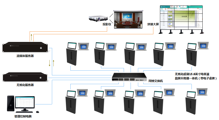 The paperless terminal adopts an integrated design and is composed of a capacitive LCD screen lifter, which facilitates later maintenance and upgrades. The system is equipped with a smart streaming media server, which is used to interconnect the paperless conference system with external video equipment to realize the interconnection and intercommunication of video signals.