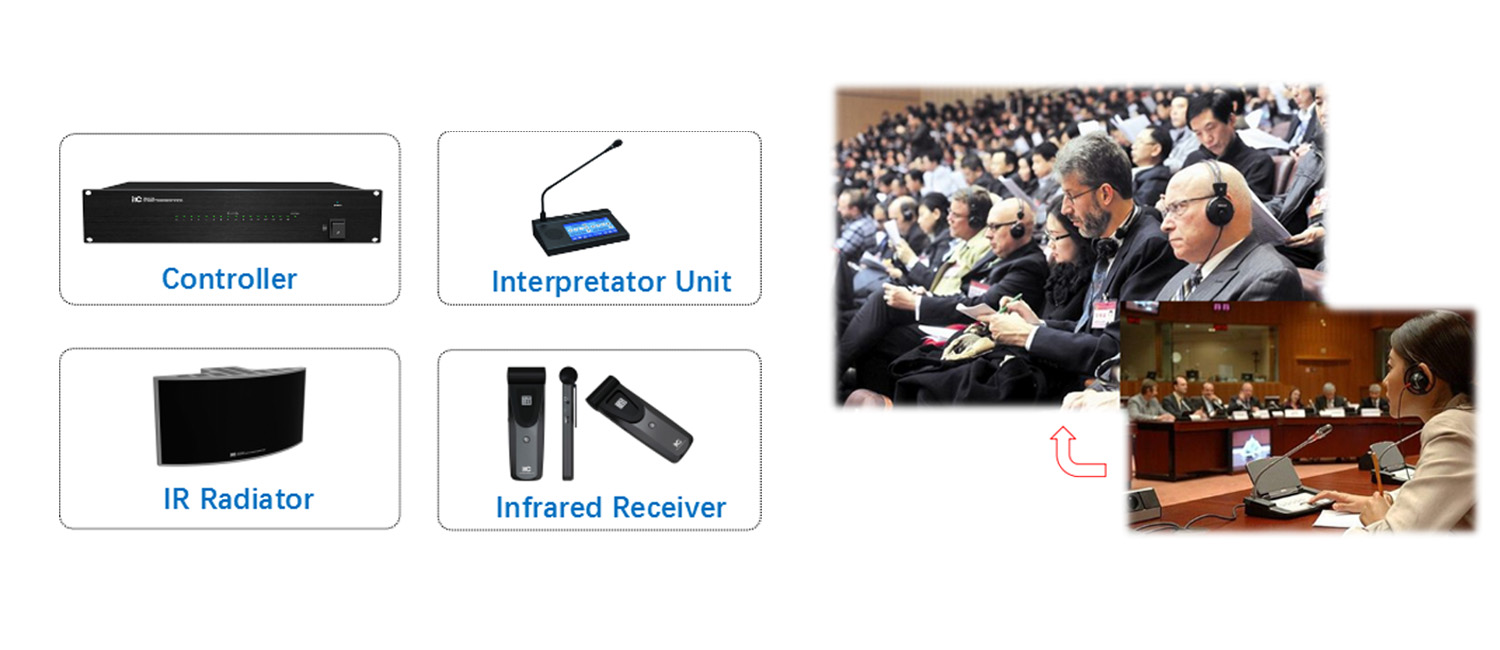 It is composed of simultaneous interpretation controller , IR Radiator, Interpretator Unit, Infrared Receiver, etc. It adopts digital audio compression coding full digital DQPSK modulation technology, and can transmit 15 translated voice and 1 original voice at the same time.